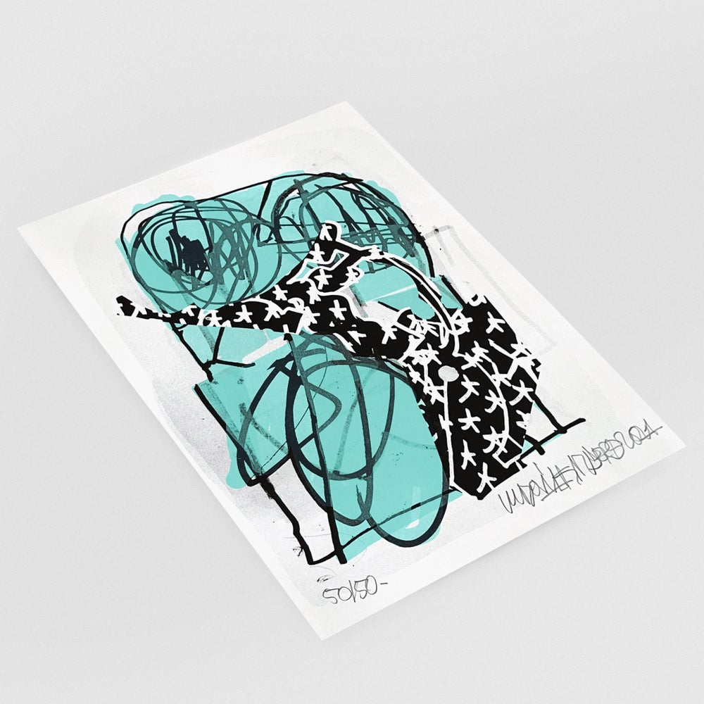 A3 (42 cm x 29.7 cm - 16.5 in x 11.6 in ) risograph print on 150g paper with 4 colors (2 layers of black and 2 layers of mint). Designed, hand numbered and signed by Ludovilk Myers, limited edition of 50.