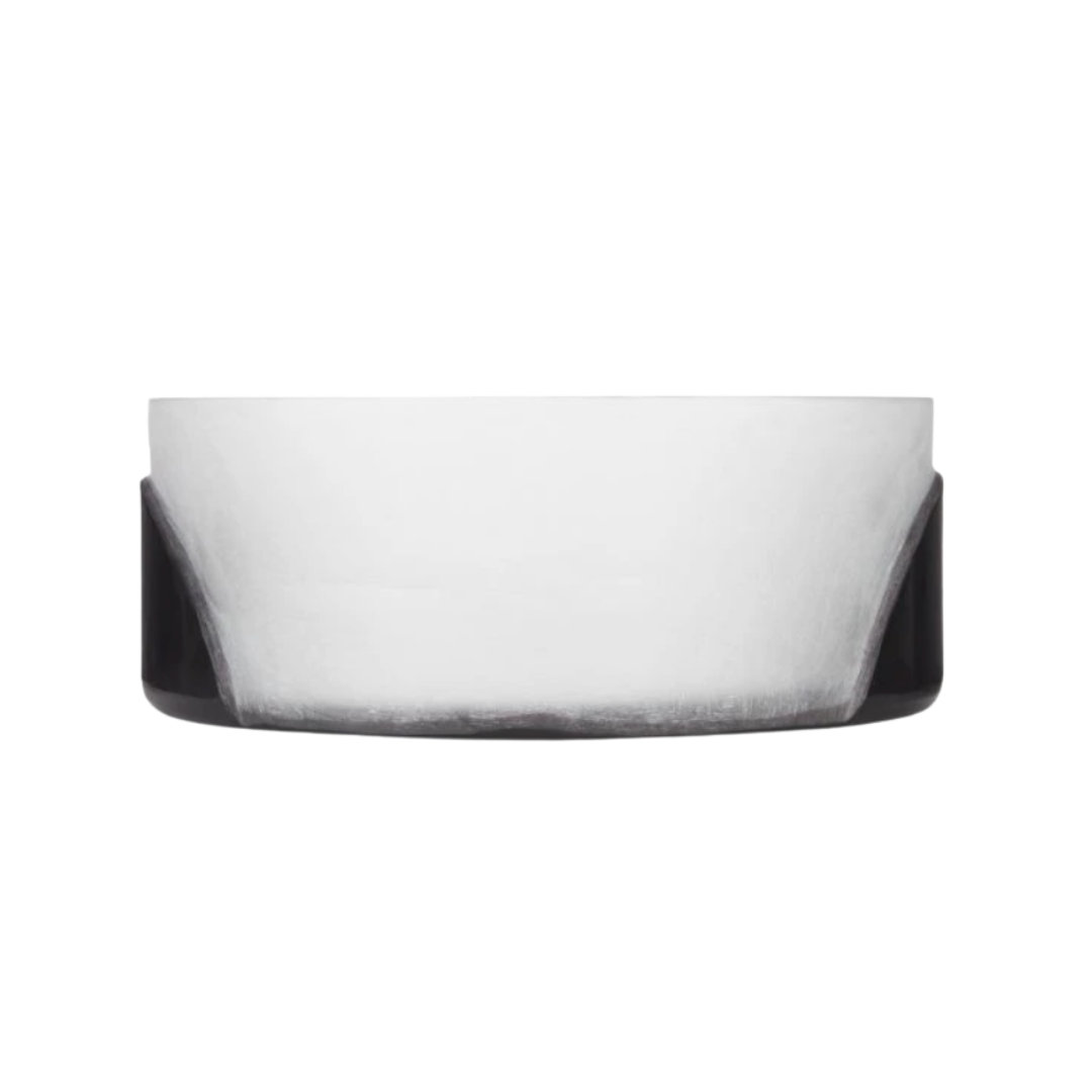 This geometric bowl is made of double layered, mouth-blown glass that has been acutely cut back to define a series of circular motifs. A Robert Motherwell painting in bowl-form, this bowl is a sculptural piece of art.