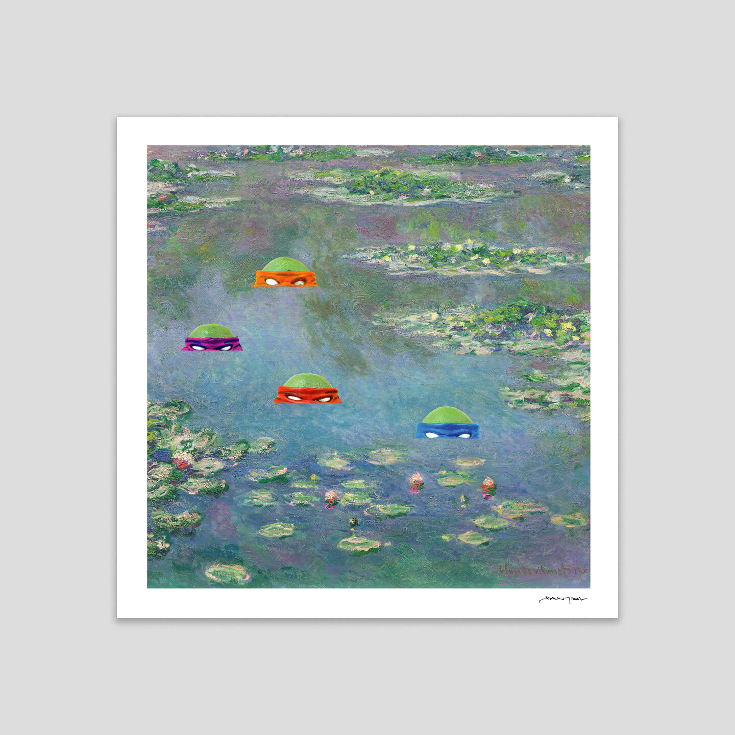 Were Ninja Turtles really hiding in Monet's water lily pond? Santlov would sure like to think so. Santlov is poking fun of the practiced perfection of the water lilies and adding a much needed sense of play and irreverence to art history. The cartoon design adds a layer of absurdity to the recognizable backdrop as Santlov asks the viewer not to take life too seriously. Just grab a slice of pizza and cowabunga!
